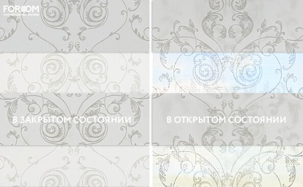 Полотно ткани, состоит из чередующихся горизонтальных полос – прозрачных и непрозрачных. Изменяя положение этих полос относительно друг другу, можно создать целых 3 режима регулировки светом. Например, чтобы в помещении стало светлее, нужно расположить прозрачные полосы друг напротив друга. Если разместить прозрачную и непрозрачную полосу параллельно друг другу, то можно добиться практически полного затемнения.